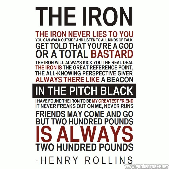 Like Henry Rollins says – 200 lbs. is 200 lbs. The Iron is a reference point, beacon and the real deal. There is no falsity to iron. In my life, the iron has never left me, disappointed me, run out on me or freaked out on me. I found this summer the one place of calm and steadiness was the gym and my truest friend the iron.