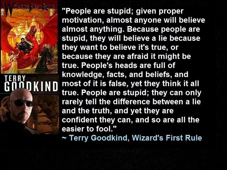 One might say this is a pretty pessimistic view of people in general. This is not a statement about people and their morality however, just their nature. Terry Goodkind and his Wizard’s Rules impressed me in their quick way of getting to human nature and laying it out there plainly and bluntly. I like someone who can take a concept and put it into a simple statement and “People are Stupid” shocks you ,and yet catches your attention, because you know in you heart it is true. I have tried to put this idea into other terms or phraseology but it never has the force of “People are Stupid.”