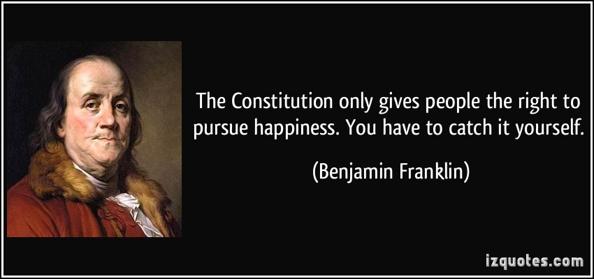 Will Smith has a great line in the movie “The Pursuit of Happiness”.  He centers on the idea of how the founding fathers has enough wisdom to put in the word ‘pursuit’.  This is what is often forgotten in this right.  You do not have the right to be happy.  You do have the right to pursue what will make you happy or what you think will make you happy.  It does not include a safety net where the government bails you out if you fail.