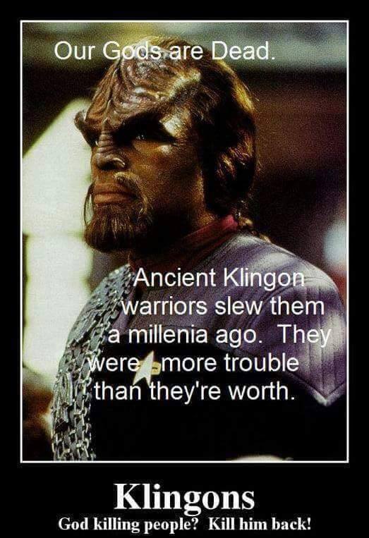 Perhaps we should take from the ficitonal Klingons the call to action to kill these gods which have been, in my opinion, more trouble than their worth.  They were at one time our first and worst attempt as a human race to uncover the knowledge around us. But spirituality is not divine, but rather very human and for that, we can only look to ourselves to uncover the truth about it. Given the amount of plundering, raping and killing done in the name of religion, it is perhaps time to revolt in our minds and kill the gods and discard them as more trouble than their worth.