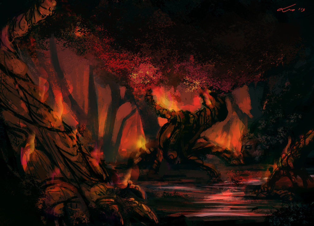Amber at this point was full-on fire girl and the werewolf snapped at the flames but then launched itself at Amber and got its jaws on her shoulder and slashed her backward with its claws. Amber fell in heap near the shore. At this point, Lunette saved the day doing her shrink down and energy pinball thing. She was hitting the werewolf so fast and continuously it finally turned tail and ran. We were not the easy prey it was expecting. By this time I was back in the game and sent a fireball after it when it struck the howl that filled the forest was defining and then the werewolf collapsed burning. It was dead in seconds, and then I turned my attention to Amber.