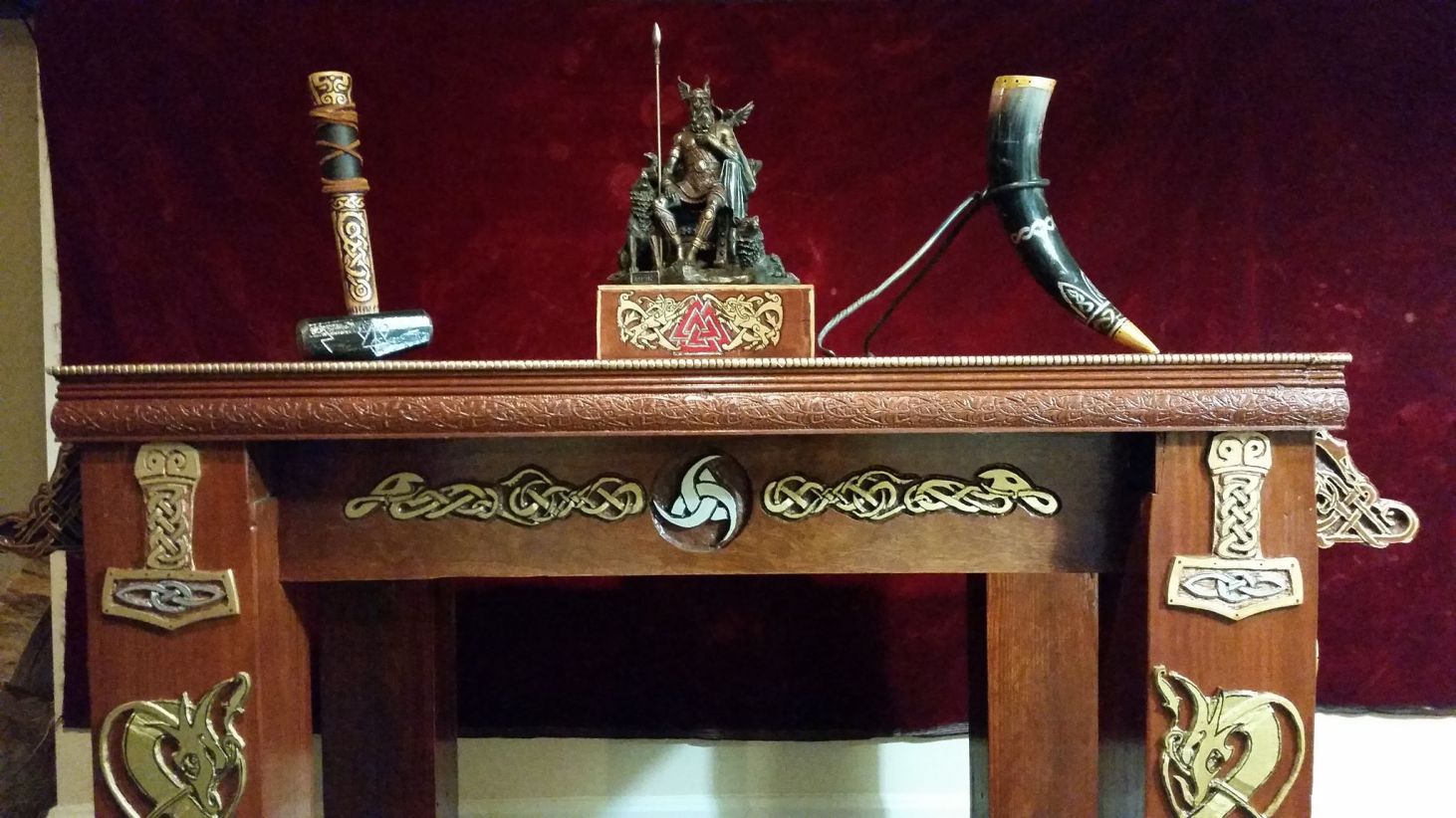 As an atheist, I don’t worship anything, but I do find that my meditation space has an altar quality to it and probably I will create something to reflect this myself. For me, of course, having a statue of Odin as the original Grey Wayfarer would be appropriate. A banner depicting wolves and ravens, a candle for a meditation focus and perhaps a spear to reflect Odin’s weapon. Runes would be prominent as well given Odin’s association with them. If I am going to meditate on the Nine Noble Virtues, I should have an appropriate setting.